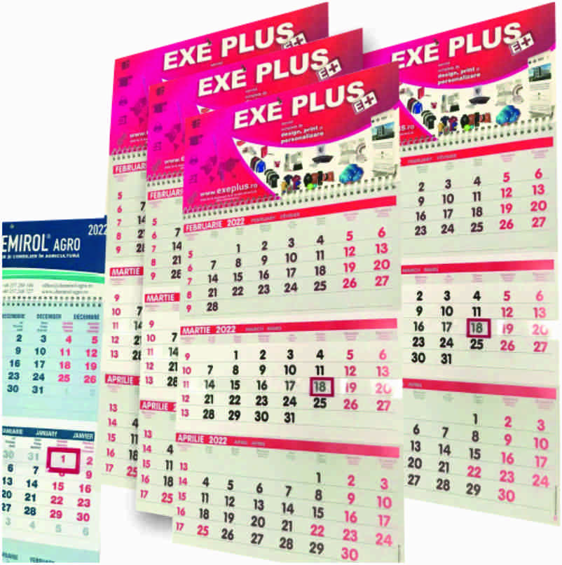 Executăm calendare spiralate, producție proprie, cu personalizare integrală: grafică la comandă, imagini, logo, culori corporate, hârtie de calitate și tipărire color. Spirale metalice durabile. Disponibile în format de perete, birou sau triptic.